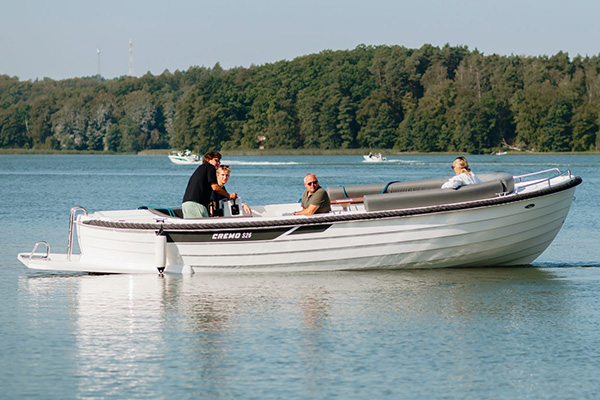 The Cremo S26 is designed for those who appreciate the art of slow boating. Built for peaceful exploration and unhurried moments on the water, it offers a calm, comfortable experience that the whole family can enjoy. Measuring just over 7 meters from bow to stern, the S26 provides generous space for friends and loved ones, along with the flexibility to choose between an electric motor or traditional petrol power. It’s the ideal companion for relaxed adventures surrounded by nature.